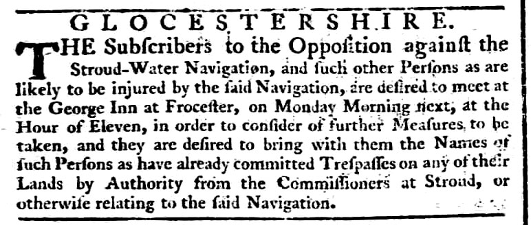 Opponents made clear their determination to obstruct the scheme. Advertisements were placed in the Gloucester Journal inviting those likely to be affected by the scheme to meet together and discuss their responses to the proposed scheme. Some landowners felt the purchase prices offered for their land were inadequate, and some twenty three mill owners below Stroud were concerned about losing water. They presented a petition to Parliament stating, there are upon the said river between Wallbridge and Framiload forty two pairs of stocks, sixteen gigg mills and seven napping mills employed in the woollen manufactory, sixteen pairs of millstones employed in grinding corn and an iron wire mill, a steel wire mill, six pair of rolls for rolling iron, a slitting mill and a rounding hammer for braziers rods employed in the manufacture of iron, all of which are wrought by wheels turned by the water of the said river for which purpose a great force and weight of water is necessary … the said mills upon a moderate calculation afford employment for 5000, and thereby give bread to above 9000 persons and during the summer months in general have not a sufficient supply of water to keep them going more than two thirds and sometimes not more than half of their time; and should the proposed navigation take place it would deprive the petitioners of a great quantity of water, & render the said mills of little use … and the petitioners apprehend that the advantages to arise from the proposed navigation will not be adequate to the injury thereby done to private property … and … will be highly injurious to the woollen & iron manufactures now carried on within the said county to a very considerable extent; and therefore praying that the petitioners may be heard by their counsel, against the said Bill and that the same may not pass into a Law or that they may have such other relief in the promises as to the House shall soon meet.