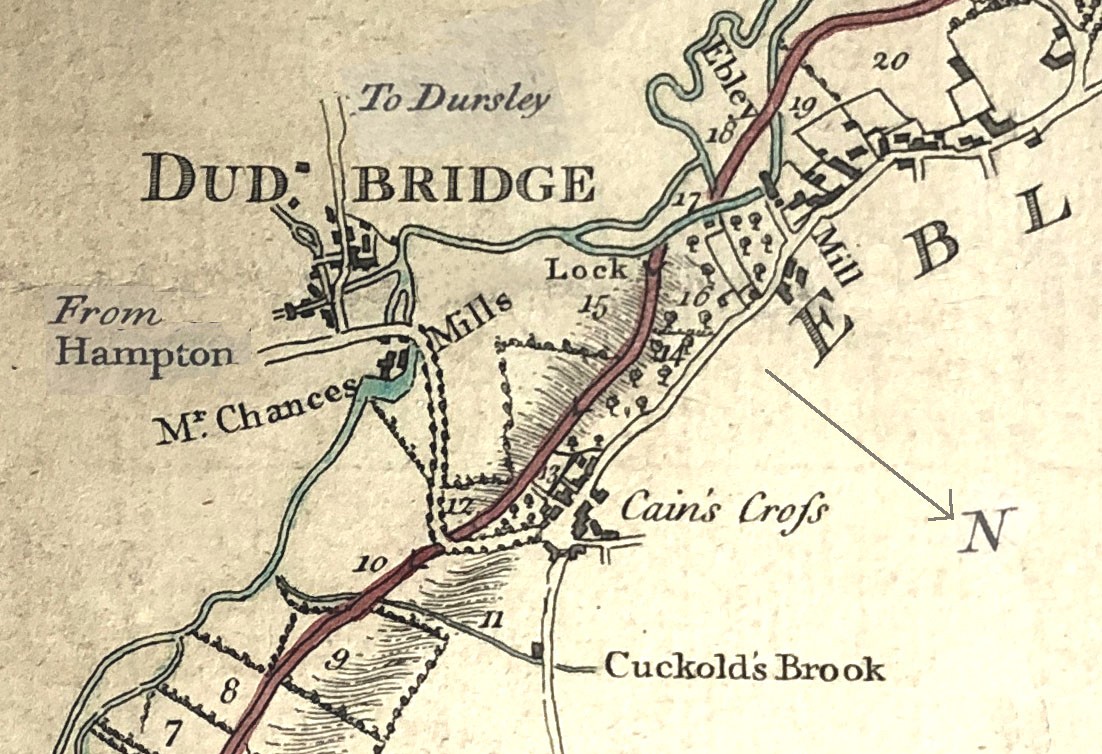 John Lawrence, millman at Whitminster Mill, and previously Eastington Mill and a supporter of the canal scheme, reported to the Committee of Directors for the Stroudwater Navigation at their meeting at the George Inn in Stroud on 18 January 1776 Cuckolds Brook empties its self into Mr Daniel Chance’s Mill Pond the third Mill below Walbridge and in the Driest time of Summer he hath seen the whole of this Streame for several Days together & for many Years diverted and turned by a Dam over a Meadow of the said Mr Chance’s to Flood it –