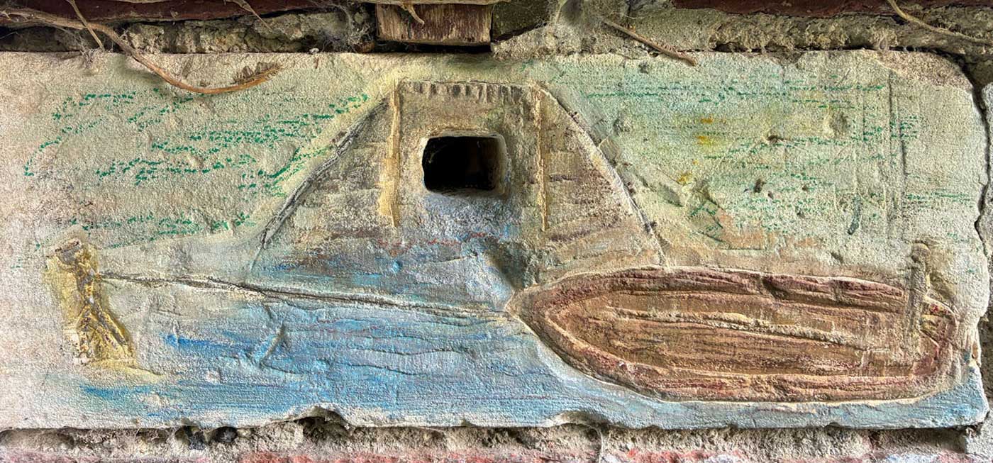 One stone depicts a man towing a boat towards the entrance to Sapperton tunnel.