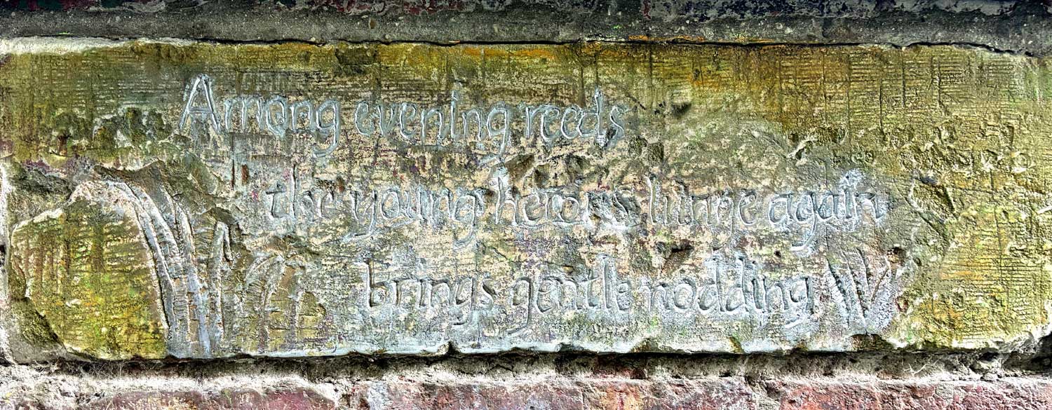 In the wall of Brimscome Mill, beside the towpath, stone carver Jim Fenton has decorated two stones for passers by to 'happen upon'.
